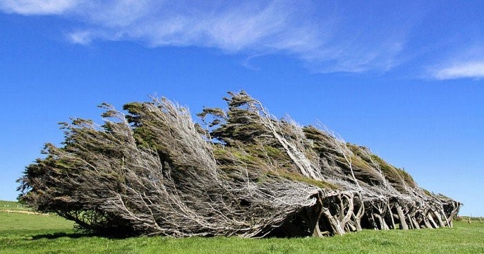 Все деревья, растущие в южной части Новой Зеландии, подвергаются суровому влиянию антарктических ветров, что приводит к изменению направлению их роста. Своим видом они напоминают нам о стойкости природы.